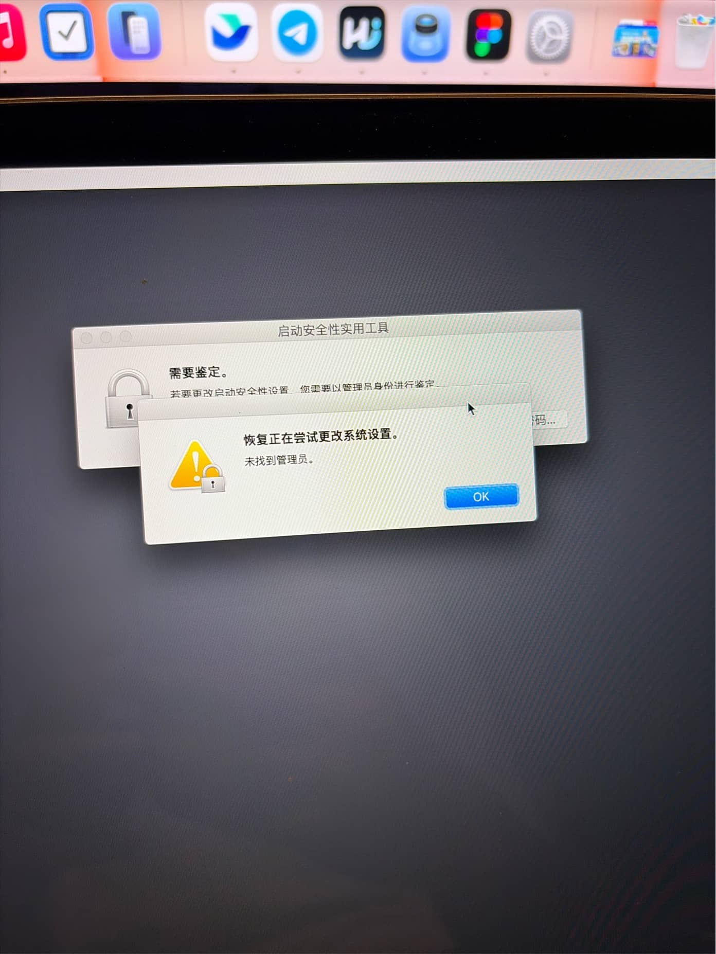 U 盘启动被拒: T2 安全芯片默认禁止外部启动。进入「macOS 恢复」中修改「安全性设置」,提示「未找到管理员」。